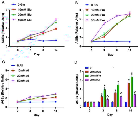 AGEs in cell-free conditions. BSA and glucose (A), fructose (B), or allulose (C) were incubated for 3, 8, or 14 days and AGEs were quantified by ELISA. AGE accrual was elevated after just 3 days with glucose and levels continued to increase through 14 days (A). Fructose caused marked increases in AGE accrual at 3, 8, and 14 days compared to controls and 10 mM, 20 mM, or 50 mM fructose led to a common ceiling of AGE formation regardless of concentration (B). Allulose caused only modest AGE formation regardless of concentration or timespan (C). A comparison of 20 mM glucose, 20 mM fructose, and 20 mM allulose revealed significant increases in glycation in glucose and fructose groups compared to controls and significantly less glycation in allulose samples compared to glucose or fructose samples (D). Experiments were conducted in quadruplicate and statistically different values are noted as p ≤ 0.05; (*) designates comparisons between 20 mM glucose or 20 mM fructose and controls and (◇) notes comparisons between allulose and glucose or fructose.