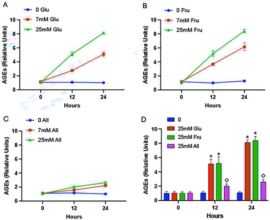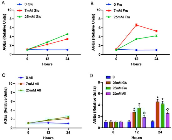 AGEs in cell lysates. Cell lysates were procured following exposure to glucose (A), fructose (B), or allulose (C) at 0 h, 12 h, or 24 h and AGEs were quantified by ELISA. Compared to 0 h samples, AGE accrual was elevated at 12 h and 24 h with glucose regardless of concentration (A). A concentration of 7 mM fructose led to peak AGE formation at 12 h, and a decrease, although still significantly higher than 0 mM controls, at 24 h (B). Allulose elicited only modest AGE formation regardless of concentration or duration (C). A comparison of 25 mM glucose, 25 mM fructose, and 25 mM allulose revealed significant increases in intracellular glycation in cells exposed to glucose and fructose compared to controls and significantly less glycation in allulose-exposed cells compared to glucose or fructose (D). Experiments were conducted in quadruplicate and statistically different values are noted as p ≤ 0.05; (*) designates comparisons between 25 mM glucose or 25 mM fructose and controls and (◇) notes comparisons between allulose and glucose or fructose.