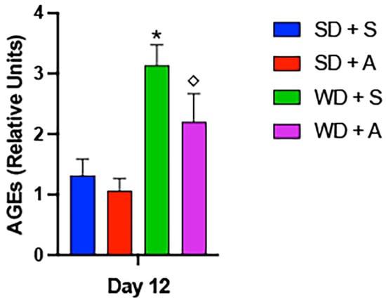 AGEs in rat serum. Total AGEs were detected in rat serum following 14 days of standard diet (SD) + stevia, Western diet (WD) + stevia, SD + allulose, or WD + allulose. There were no glycation differences between rats fed the standard diet. AGE formation was significantly elevated in rat serum following Western diet exposure and notably, Western diet-mediated glycation was significantly decreased with allulose compared to stevia. Experiments involved n = 10 rats and statistically different values are noted as p ≤ 0.05; (*) designates comparisons between SD + stevia and WD + stevia and (◇) notes comparisons between WD + stevia and WD + allulose.