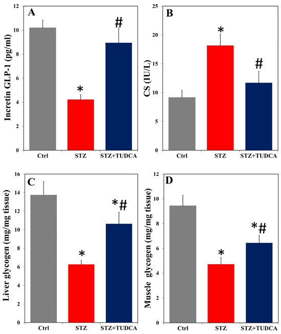 TUDCA increased serum incretin GLP-1 (A), decreased serum CS (B), and enhanced liver/muscle glycogen storage (C,D) in STZ-induced diabetic rats. Data are expressed as mean ± SD (n = 5). * p < 0.05 versus control (Ctrl), and # p < 0.05 versus STZ.