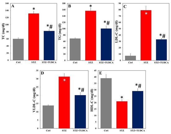 TUDCA decreased serum levels of TC (A), TG (B), LDL-C (C), and VLDL-C (D) and increased HDL-C (E) in STZ-induced diabetic rats. Data are expressed as mean ± SD (n = 5). * p < 0.05 versus control (Ctrl), and # p < 0.05 versus STZ.