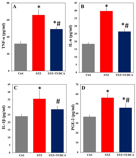 TUDCA decreased serum TNF-α (A), IL-6 (B), IL-1β (C), and PGE-2 (D) in STZ-induced diabetic rats. Data are expressed as mean ± SD (n = 5). * p < 0.05 versus control (Ctrl), and # p < 0.05 versus STZ.