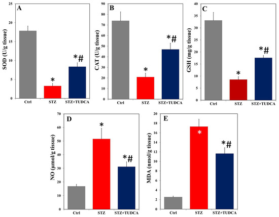 TUDCA increased pancreatic SOD (A), CAT (B), and GSH (C) and decreased NO (D) and MDA (E) in STZ-induced diabetic rats. Data are expressed as mean ± SD (n = 5). * p < 0.05 versus control (Ctrl), and # p < 0.05 versus STZ.