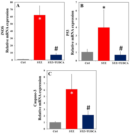 TUDCA downregulated pancreatic mRNA expression of iNOS (A), p53 (B), and caspase-3 (C) in STZ-induced diabetic rats. Data are expressed as mean ± SD (n = 4 or 5). * p < 0.05 versus control (Ctrl), and # p < 0.05 versus STZ.