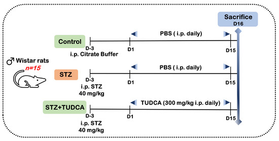 The diabetic model was induced through a single i.p. injection of low-dose STZ (40 mg/kg b.w.), which was freshly prepared with sodium citrate buffer (0.1 M/L; pH 4.5) [66]. The STZ-injected animals received a glucose solution (20%) for 24 h to prevent STZ-induced initial hypoglycemia. A total of 72 h after STZ injection, tail blood was taken to determine the glucose level using a glucometer (Frankenberg, Germany) and reagent strips (Accu-Chek, Roche, Basel, Switzerland). Rats with a fasting blood glucose level of more than 200 mg/dL were selected for further experimentation. The rats were randomly divided into three groups (with five rats in each group), as follows: nondiabetic control (Ctrl), STZ (diabetic Ctrl), and STZ+TUDCA. TUDCA treatments (300 mg/kg b.w. dissolved in sterile PBS) were started after the induction of diabetes, and this was continued for 15 days [25]. Meanwhile, the rats in the control group received the same volume of vehicle(s) as the STZ- and STZ+TUDCA-treated animals (Figure 8). At the end of the experiment, the rats were deprived of food overnight and sacrificed after light ether anesthesia. The blood was allowed to clot in a centrifuge tube and the sera were centrifuged at 3000× g (Hettich Zentrifugen, Universal 32 R, Darmstadt, Germany) for 5 min at 4 °C. The serum was separated and stored at −20 °C pending biochemical analyses. Organs (liver, muscle, and pancreas) were obtained and prepared for further assays. The remaining parts of the pancreatic tissues were immediately submerged in liquid nitrogen and kept at −80 °C for molecular testing (qRT-PCR).