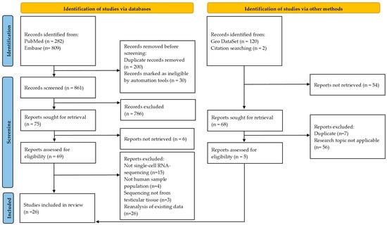 The databases PubMed, Embase, and the GEO DataSet were screened for articles from 2009 to 31 March 2024. Papers published before 2009 were excluded because this was the year that scRNA-seq was published for the first time [26]. The literature search was conducted by combining the following concepts: “testis” and “Single-Cell Gene Expression Analysis” in humans. Forward and reverse snowballing was allowed to identify extra articles of interest. The full literature search strings for the three databases are included in Appendix A, Appendix B and Appendix C.