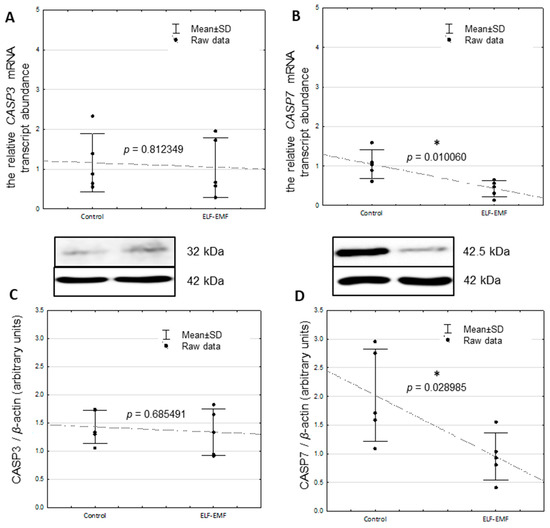 (A,C) CASP3 and (B,D) CASP7 mRNA transcript and protein abundance (32 kDa, 42.5 kDa, respectively) in control and ELF-EMF-treated (50 Hz, 2 h, 8 × 104 mG) endometrial slices of pigs during the peri-implantation period (five biological replicates). Control and ELF-EMF-exposed slices were incubated separately in water-shaking baths. Data are presented as raw data ± SD (each data point in the figure consists of an average of two individual measurements). Student’s t-test was performed during the statistical analysis. In the protein abundance analyses, the mean value of the optical density of the proteins was normalized to the optical density of β-actin (42 kDa). For the analysis of CASP3, CASP7, and ACTB protein, separate 15% gels were prepared due to the molecular weights of the analyzed proteins being very similar. Asterisks above the bars imply statistically significant differences (* p < 0.05).