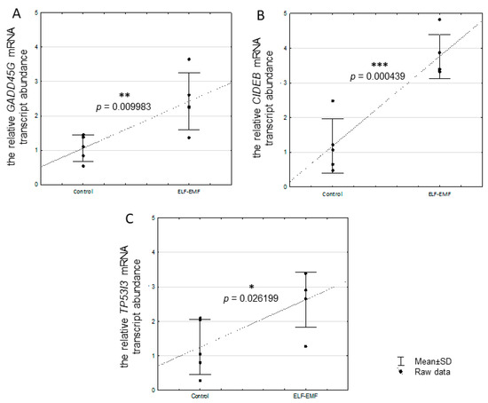 Relative abundance of GADD45G (A), CIDEB (B), and TP53I3 (C) mRNA transcripts in the ELF-EMF-treated (50 Hz, 2 h, 8 × 104 mG) endometrial slices collected from pigs (five biological replicates) during the peri-implantation period. Control and ELF-EMF-exposed slices were incubated separately in water-shaking baths. Data are presented as raw data ± SD (each data point in the figure consists of an average of two individual measurements). Student’s t-test was used for statistical analysis. Asterisks above the bars imply statistically significant differences (* p < 0.05, ** p < 0.01, *** p < 0.001).