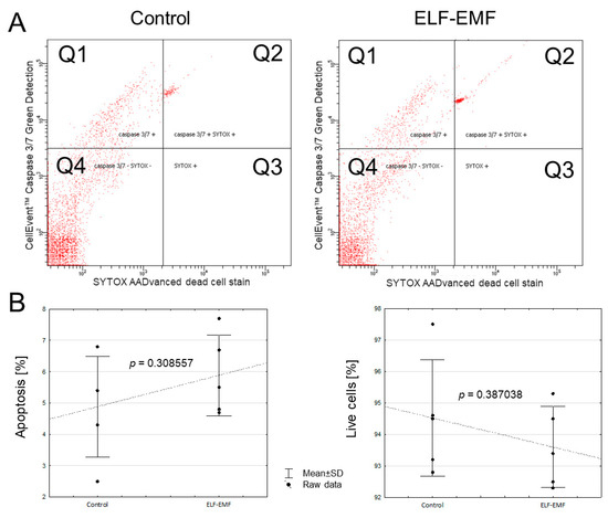 The assessment of activated CASP3 and CASP7 in cells isolated from endometrial slices treated in vitro with the ELF-EMF (50 Hz, 2 h, 8 × 104 mG; the effect of the ELF-EMF on the apoptosis process). Endometrial slices were collected from pigs (five biological replicates) during the peri-implantation period. The control and the ELF-EMF-exposed slices were incubated separately in water-shaking baths. Cell apoptosis was evaluated using dual-color analysis (CellEvent™ Caspase-3/7 Green Detection Reagent and SYTOX AADvanced Dead Cell Stain) with a commercially available kit and the flow cytometry technique. Data are presented as scatter plots (A) and graphs illustrating the percent of apoptotic and live cells (raw data ± SD; (B)); each data point in the figure consists of an average of two individual measurements). Data obtained after flow cytometry analysis were analyzed by Student’s t-test. The quadrants of the scatter plot represent as follows: Q1 (upper left)—apoptotic cells, Q2 (upper right)—apoptotic and necrotic cells, Q3 (lower right)—necrotic cells, Q4 (lower left)—live cells.