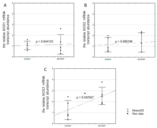 Relative abundance of NOS1 (A), NOS2 (B), and NOS3 (C) mRNA transcripts in the ELF-EMF-treated (50 Hz, 2 h, 8 × 104 mG) endometrial slices collected from pigs (five biological replicates) during the peri-implantation period. The control and the ELF-EMF-exposed slices were incubated separately in water-shaking baths. Data are presented as raw data ± SD (each data point in the figure consists of an average of two individual measurements). During the statistical analysis, Student’s t-test was performed. Asterisks above the bars imply statistically significant differences (* p < 0.05).