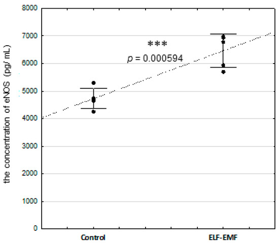 The concentration of eNOS in the ELF-EMF-treated (50 Hz, 2 h, 8 × 104 mG) endometrial slices collected from pigs (five biological replicates) during the peri-implantation period. The control and the ELF-EMF-exposed slices were incubated separately in water-shaking baths. Data are presented as raw data ± SD (each data point in the figure consists of an average of two individual measurements). The statistical analysis was performed using Student’s t-test. Asterisks above the bars imply statistically significant differences (*** p < 0.001).