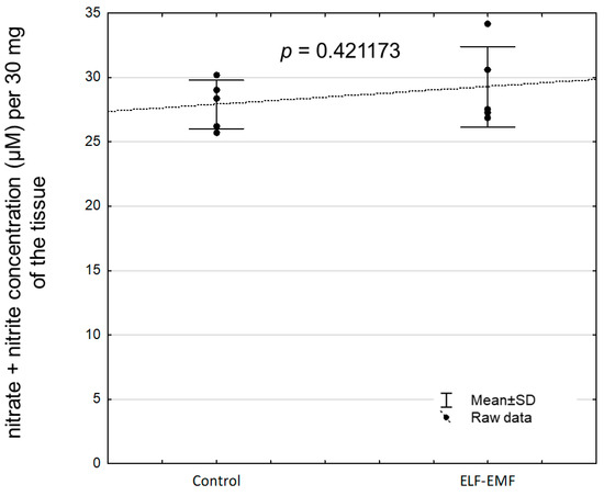 The concentration of eNOS protein was statistically significantly increased in the endometrium exposed to the ELF-EMF compared to non-exposed tissue (Figure 5, p = 0.000594). There was no statistically significant difference in nitrate and nitrite concentrations between the ELF-EMF-treated and control endometrium (Figure 6, p = 0.421173).