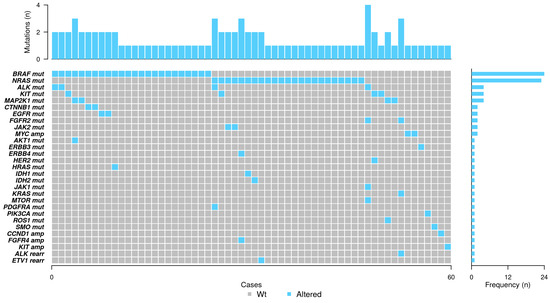 Co-mutation plot of genetic alterations identified by next-generation sequencing. Spectrum of genes (rows) with alterations identified in 87 advanced melanoma cases (columns). Sixty cases are mutated. The percentage of samples with an alteration detected is depicted in the right histogram. Altered genes are highlighted in blue, while grey indicates those analyzed cases with no identified alterations. mut, mutation; amp, amplification; rearr, rearrangement; Wt, wild type.