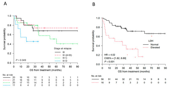 Kaplan–Meier curves for the overall survival (OS) from the time of treatment according to the stage at relapse (A), OS from the time of treatment according to the LDH levels (B). Numbers at risk are indicated at selected time points. Stage III: no distant metastasis (regional lymph node metastasis, in-transit or satellite cutaneous metastasis (M1). Stage IV A+B: A, Distant metastasis to skin, soft tissue including muscle and/or non-regional lymph node; B, lung metastasis. Stage IV C: distant metastasis to non-central nervous system (CNS) visceral sites with or without M1 A or M1 B sites of disease. Stage IV D: distant metastasis to CNS with or without M1 A, M1 B, or M1 C sites of disease. LDH elevated ≥234 U/L. The hazard ratio (HR) and the p-value (P) from the log-rank test comparing the two groups are shown.
