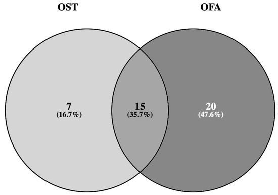 Venn diagram showing that 15 hotspot genes overlap between both the oncomine solid tumor (OST) and oncomine focus assay (OFA) [36], accessed on 23 December 2023.
