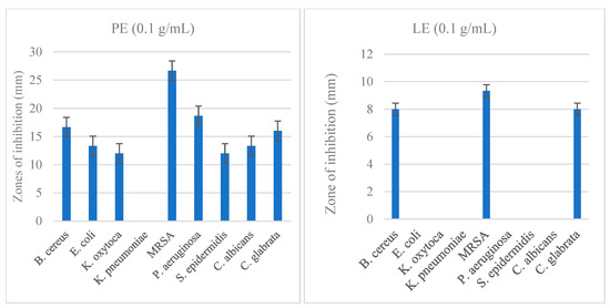 As for LE (10 µL and 20 µL solutions at 0.1 g/mL), it did not inhibit bacterial growth and led to negligible ZOI of S. aureus (Figure 2).