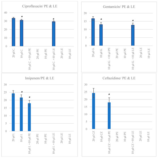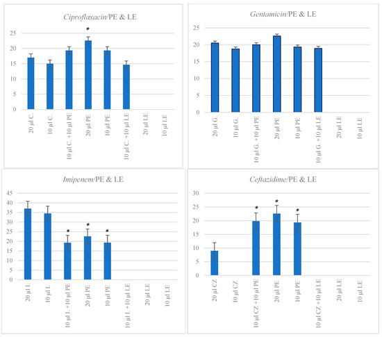 Commercial discs with common antibiotics were first immersed in sterile distilled water (10 discs per 1 mL of water), left for 1 h at 25 °C for complete diffusion to make up the following stock solutions of antibiotics: Ciprofloxacin 50 ng/µL, Imipenem 100 ng/µL, Gentamicin 100 ng/µL, and Ceftazidime 300 ng/µL. Discs were dried at room temperature for at least 20 min. The antibacterial activity of PE and LE was then evaluated alongside 2 different concentrations of antibiotics by loading volumes of 10 µL and 20 µL of antibiotic solutions onto sterile blank discs. Two different concentrations of PE and LE extracts were used by loading a volume of 10 µL and 20 µL extract solutions (0.1 g/mL) onto discs. Different combinations of antibiotics and/or extracts were used, as shown in Table 1.