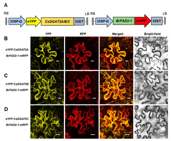 Each CsDGAT2 homoeolog was fused to yellow fluorescence protein (YFP) lacking the stop codon at its 5′-end. The expression cassette was constructed from the cauliflower mosaic virus (CaMV) 35S promoter with the 5′-untranslated region leader (Ω) sequence of the tobacco mosaic virus and the 35S terminator using the Golden Gate cloning method [48]. The monomeric red fluorescent protein (mRFP)-fused BrFAD2-1 and the tobacco bushy stunt virus p19 were used as an ER marker and a suppressor of virus-induced gene silencing, respectively [49,50]. After Agrobacterium tumefaciens (strain GV3101) was cultured at 28 °C overnight, the OD600 of Agrobacterium carrying YFP-fused CsDGAT2, mRFP-fused BrFAD2-1, and p19 was adjusted to 0.8, 0.8, and 0.4, respectively, with an infiltration buffer [10 mM 2-(N-morpholino)ethanesulfonic acid (MES) (pH 5.6), 10 mM MgCl2, 200 μM acetosyringone]. Mixed Agrobacterium was infiltrated into 5-week-old N. benthamiana leaves. Agroinfiltrated N. benthamiana leaves were cut off and the fluorescence signal was checked using a TCS SP8 laser scanning confocal microscope (Leica, Germany) 36–48 h after infiltration. YFP and mRFP were excited at 514 nm and 561 nm, respectively, and their fluorescence was observed at 518–553 nm and 573–616 nm, respectively.