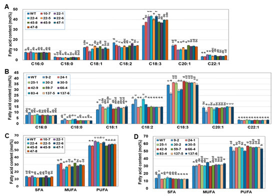 Figure 2C showed the comparison results by grouping saturated fatty acids (SFAs), monounsaturated fatty acids (MUFAs), and PUFAs. In the seed oil from EDD1 T2 plants, the SFA contents were significantly decreased compared to the WT, except for #10-7, #45-9, and #47-8. Compared to the MUFA content of the WT, that of #47-1 and #47-8 was similar, whereas that of #10-7 and #45-8 was significantly increased, and that of other lines was significantly decreased. Compared to the PUFA content of the WT, those of all EDD1 lines were increased, except for #10-7 and #45-8. However, most of the individuals with a significantly increased C18:3 content had a decreased C18:2 content (Figure 2A); thus, the PUFA content of all EDD1 lines slightly increased compared to that of the WT. EDD1 #22-1 had a PUFA content increased by 6.3 mol% and a MUFA content decreased by 6.8 mol% compared to the WT, showing the greatest fatty acid changes.