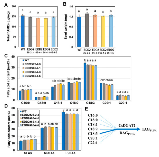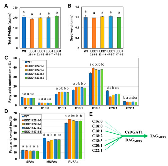Figure 4. Seed phenotype analysis of T3 EDD2 mutants. (A) Total FAMEs per mg seeds. (B) Seed weight. (C) Seed fatty acid content. (D) Fatty acid content of each of the three different types: saturated fatty acid (SFA), monounsaturated fatty acid (MUFA), and polyunsaturated fatty acid (PUFA). (E) Biosynthetic pathway of TAG (triacylglycerol) from DAG (diacylglycerol) and C16:0 to C22:1 fatty acids by CsDGAT2. This indicates that CsDGAT2 prefers DAGs with PUFAs and PUFAs, especially C18:3, as the acyl substrates, resulting in the biosynthesis of TAGs with a high PUFA content. In (C), minor fatty acids such as C20:0 and C20:2 were omitted. All experiments were performed in triplicate, and the error bar is the standard error. The values were statistically analyzed using one-way ANOVA followed by Tukey’s test (p < 0.05). Lowercase letters above the bars indicate the results of a one-way ANOVA statistical test.