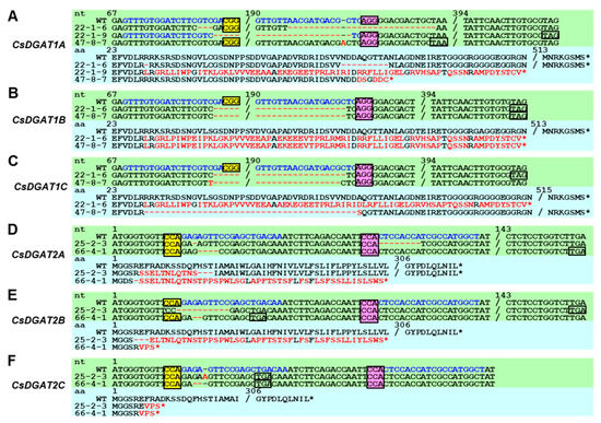 Figure 5. Nucleotide sequences (pale-green background) and deduced amino acid sequences (sky-blue background) of CsDGAT1 and CsDGAT2 homoeologs from T2 mutants. (AC) CsDGAT1A to CsDGAT1C homoeologs from EDD1 mutants and (DF) CsDGAT2A to CsDGAT2C homoeologs from EDD2 mutants showed diverse mutation types. The indel patterns of CsDGAT1B and CsDGAT1C in EDD1#22-1-9 were identical to those in #22-1-6. Red letters indicate different nucleotides or amino acids compared to WT. Red dashes and asterisks represent gaps produced by deletions and the termination of translation, respectively. Blue nucleotide sequences are sgRNA1 and sgRNA2. Yellow box and pink box indicate the protospacer-adjacent motif (PAM) sequence of sgRNA1 and sgRNA2, respectively, and the blank box indicates the premature stop codon caused by deletion. Asterisks indicate the termination of the translation by a stop codon.