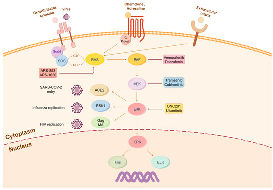 The role of the MAPK/ERK pathway in virus replication. The canonical MAPK/ERK cascade is triggered by the binding of extracellular ligands (e.g., growth factor or viral envelop proteins), chemokine, and extracellular matrix. The activated MAPK/ERK pathway is exploited by various viruses to sustain their self-replication. For instance, RSK1 plays a pivotal role in the nuclear export of vRNP during influenza virus replication, Gag MA protein facilitates the replication of the HIV reverse transcription complex, ACE2 receptor serves as the key receptor for SARS-CoV-2 infection, and the c-fos transcription factor downstream of ERK is hijacked for the replication of HSV2 (herpes simplex virus 2). The pathway inhibitors for cancer therapy that can be possible to repurpose are highlighted.