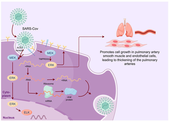 The replication of SARS-CoV-2 exploits the MAPK/ERK pathway but is less dependent than influenza virus [47]. SARS-CoV-2 infection triggers early monophasic activation of the MAPK/ERK signaling pathway, which plays an important role in the early stage of the life cycle, engaging the TMPRSS2-mediated cell surface entry mechanism [48]. The S1 subunit also triggers phosphorylation of MEK and activation of the downstream pathway 49]. The activated ERK modulates ACE2 expression levels. Thus, MEK inhibitors exert a negative influence on ACE2 expression, thereby mitigating early infection [6]. On the other hand, the activated MEK/ERK pathway promotes cell growth in pulmonary artery smooth muscle and endothelial cells, leading to thickening of the pulmonary arteries, which was observed in lung sections from patients who died of COVID-19, in contrast to patients who died of influenza virus [49]. In addition, the S protein also upregulates expression of COX-2, an inflammatory enzyme, which activates PKCα upstream of the Raf [50].