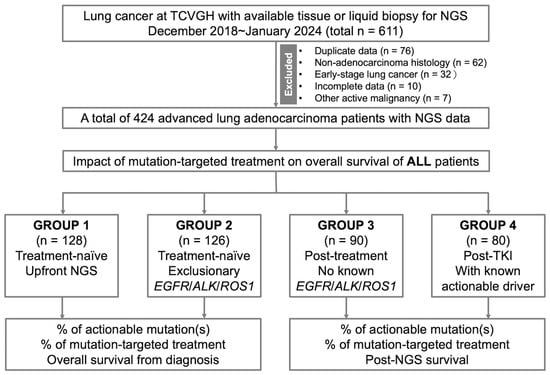 This was a retrospective study, which included lung cancer patients diagnosed and treated at Taichung Veterans General Hospital from December 2018 to January 2024. To be eligible for the study, patients were required to have pathologically confirmed lung adenocarcinoma, inoperable stage III to IVB disease, and available NGS testing results as well as a precise history of diagnosis, treatment, and survival follow-up. With regard to NGS, results from both tumor tissue and liquid biopsy were acceptable for study inclusion. Patients were excluded if they had mixed histology other than adenocarcinoma, other active malignancy, stage III disease with an attempt of curative local therapy, or incomplete data records.