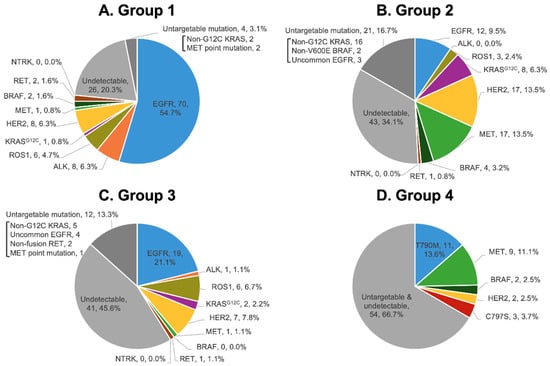 Distribution of targetable mutation(s) among various patient populations: Group 1 (A), Group 2 (B), Group 3 (C), and Group 4 (D).