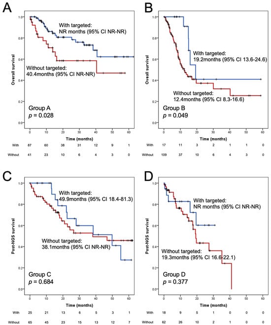 Survival benefits of next-generation sequencing and mutation-targeted treatment among various patient populations: Group 1 (A), Group 2 (B), Group 3 (C), and Group 4 (D).