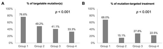 Because the clinical and genetic characteristics of the four groups of patients were not the same, we further analyzed the clinical benefits of mutation-targeted treatment among the four groups. The results of the percentage of targetable mutation(s) and mutation-targeted treatment among various patient populations are shown in Figure 4. The percentages of potential targetable mutation(s) were 76.6%, 49.2%, 41.1%, and 33.3% in the Group 1, Group 2, Group 3, and Group 4 patients, respectively (p < 0.001). The percentages of mutation-targeted treatment were 68.0%, 15.1%, 27.8%, and 22.5% in Group 1, Group 2, Group 3, and Group 4 patients, respectively (p < 0.001). Treatment-naïve patients with upfront NGS testing had the highest likelihood of having targetable mutation(s) and receiving the corresponding targeted therapies.