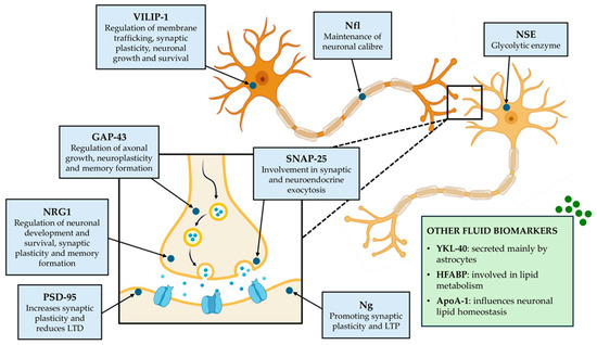 A schematic representation of the main fluid biomarkers involved in Alzheimer’s disease (AD). In the cytoplasm of neurons, neuron-specific enolase (NSE) with glycolytic enzymatic action and visinin-like protein 1 (VILIP-1), which regulates membrane transport, synaptic plasticity, as well as neuronal growth and survival, are localized. Neurofilament light chain (Nfl) is an intermediate filament protein localized in the axon, which controls the maintenance of the neuronal caliber. Other proteins are in the cytoplasm of the presynaptic neuron: growth-associated protein 43 (GAP-43), involved in axonal growth, neuroplasticity, and memory formation; neuregulin 1 (NRG1) regulates neuronal development and survival, synaptic plasticity, and memory modulation; synaptosomal-associated protein 25 (SNAP-25) is responsible for synaptic and neuroendocrine exocytosis. At the level of the postsynaptic membrane, postsynaptic density protein 95 (PSD-95), which increases synaptic plasticity and reduces long-term depression (LTD), and neurogranin (Ng), which promotes synaptic plasticity and long-term potentiation (LTP), are localized. Other fluid biomarkers associated with the pathogenesis of AD, but not localized in neurons, include chitinase 3-like protein 1 or human cartilage glycoprotein 39 (YKL-40) secreted mainly by astrocytes, heart fatty acid binding protein (HFABP) with a role in lipid metabolism, and apolipoprotein A1 (ApoA-1) that influences neuronal lipid homeostasis.
