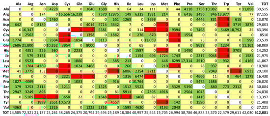 Among all the 3145 proteins that were involved in MRD, several imply impossible double or triple nucleotide codon changes, as we observed in their amino acid replacement matrix, see Figure 2. Then, as we have previously performed in the general case of all the ClinVar missense variants [10], we performed a preliminary removal of the latter anomalous items. Thus, for our structural Bioinformatics analysis, we have obtained a final dataset containing 2797 proteins undergoing MRD pathogenic variants.