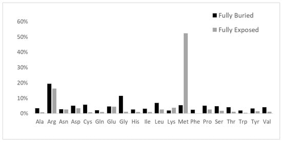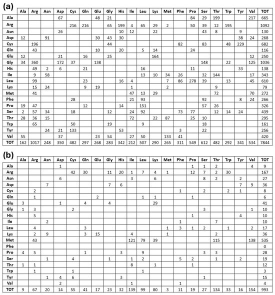 Furthermore, from inspection of the amino acid replacement matrices of the latter two groups of variants, shown in Figure 5, several features are worth a preliminary discussion. As far as fully buried mutation sites are concerned, Gly and Arg are equally abundant and much more frequent than all the other replaced amino acids, see Figure 5b, and Cys, despite its low occurrence in proteins, exhibits a very frequent involvement in pathogenicity. In the case of fully exposed mutation sites, see Figure 3 and Figure 4, a main signal arises from the observation that very frequent substitutions occur for Met and Arg, representing, respectively, 53% (a total of 535 in the fully exposed regions) and 17% (a total of 1092 in the fully buried regions) of the total ones. The relevance of these findings in relation to MRD onset is underlined in Section 3 of the present report.
