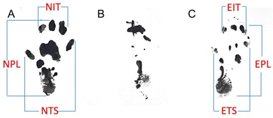 Walking tracks for all animals were performed 1 day prior to the initial surgery, one day prior to euthanasia (120 days), and at intermediate timepoints of 30, 60, and 90 days postoperatively. Rats had their hind paws dipped in ink and traversed a walking track with their footprints recorded on paper. SFI measurements were obtained from footprints using Equation (1), as described by Sarikcioglu et al. [] (Figure 3).