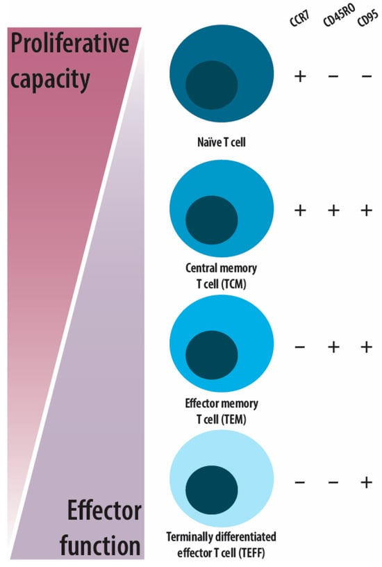 Simplified view of memory T cell subsets examined in this study, distinguished based on differential expression patterns of CCR7, CD45RO, and CD95. Naïve T cells are CCR7+CD45RO−CD95−; central memory T cells (TCM) are CCR7+CD45RO+CD95+; effector memory T cells (TEM) are CCR7−CD45RO+CD95+; and terminal effector T cells, also named terminally differentiated T cells (TEFF), are CCR7−CD45RO−CD95+, in accordance with previous findings by Gattinoni et al. []. As shown, the proliferative ability of T cells decreases along with differentiation and gain of effector function.