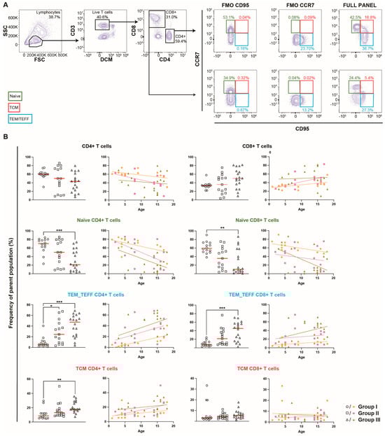 Variations in T-cell populations in peripheral venous blood among the groups. (A) Gating of naïve (CCR7+CD95−) and memory (CCR7+/−) T cells was performed on DCM−CD3+ single lymphocytes, which expressed either CD4 or CD8. Memory T cells were further sub-grouped into TCM (CCR7+CD95+) or TEM/TEFF (CCR7−CD95+) cells. Fluorescence minus one (FMO) controls were used for the gating of naïve and memory T-cell populations. Gating of the control cohort was similar, but included CD45RO, and is described in detail by Nilsson et al. []. (B) The differences in the proportions of T-cell subpopulations among the three groups (n = 47), and according to age, specifically looking at CD4+ and CD8+ bulk T cells, CD8+ and CD4+ naïve T-cell subsets, as well as memory T-cell subsets for both CD4+ and CD8+ T cells. A Kruskal–Wallis, with Dunn’s multiple comparison test, was used on the grouped scatter plots to determine any significant differences. Statistical significance was determined as p < 0.05 (* p < 0.05, ** p < 0.01, *** p < 0.001), and the median is shown as a red horizontal line.