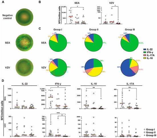 The functional status of the T cells was assessed through the simultaneous quantification of IL-22-, interferon (IFN)-γ-, IL-10-, and IL17-A-secreting cells upon T-cell mitogen (i.e., polyclonal activation) staphylococcal enterotoxin A (SEA), or VZV-specific (i.e., antigen-specific activation) stimulation (Figure 3A). First, spot-forming cell (SFC) counts for all cytokines were pooled for individuals with a complete assay that included all four cytokines. The number of total SFCs differed among the groups for both polyclonal and antigen-specific activation (Figure 3B). Group I had significantly more total SFCs upon SEA stimulation compared to group III (6245 (490–11,945) vs. 1080 (11–12,800), p < 0.05). Upon VZV stimulation, groups I and II had a similar total SFC count, whereas group III had a markedly lower response. This shift became significant when comparing the total SFCs following VZV stimuli in group II with those in group III (183 (30–3181) vs. 47 (9–368), p < 0.05, Figure 3B).