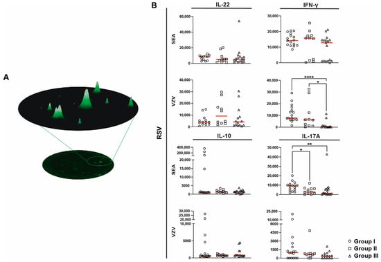 Residual spot volumes (RSV) upon stimulation with Staphylococcal enterotoxin A (SEA) or varicella zoster virus (VZV) peptides. (A) Schematic representation of RSV analysis. Using software algorithms, the RSV of individual spots was measured. These values were then determined as the area under the curve. (B) Differences in RSV from IL-22 (SEA n = 40, VZV n = 37), IFN-γ (SEA n = 44, VZV n = 40), IL-10 (SEA n = 44, VZV n = 40), and IL17-A (SEA n = 44, VZV n = 40) spot-forming cells following SEA or VZV stimuli among groups. Statistical analysis was performed using a Kruskal–Wallis test with Dunn’s multiple comparison. Statistical significance was determined as p < 0.05 (* p < 0.05, ** p < 0.01, **** p < 0.0001), and the median is shown as a red horizontal line.