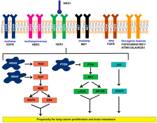 Figure 1. Molecular determinants and cellular cascades that increase the propensity for lung cancer proliferation and brain metastasis. anaplastic lymphoma kinase (ALK), amplification (amp), v-raf murine sarcoma viral oncogene homolog B (BRAF), epidermal growth factor receptor (EGFR), extracellular signal-related kinases (ERK), fibroblast growth factor receptor (FGFR), human epidermal growth factor receptor (HER), Janus kinase (JAK), Kristen rat sarcoma viral oncogene homolog (KRAS), mitogen-activated protein kinase (MAPK), mitogen-activated extracellular signal-regulated kinase (MEK), mesenchymalepithelial transition factor (MET), mammalian target of rapamycin (mTOR), mutation (mut), nuclear factor-ĸB (NF-KB), neuregulin 1 (NRG1), neurotrophic tyrosine receptor kinase (NTRK), overexpression (overexp), protein kinase B (PKB/AKT), phosphatase and tensin homolog deleted on chromosome 10 (PTEN), phosphatidylinositol-3 kinase (P13k), rapidly accelerated fibrosarcoma (RAF), RAS (rat sarcoma), rearranged during transfection (RET), c-ros oncogene 1 (ROS1), signal transducer and activator of transcription (STAT).