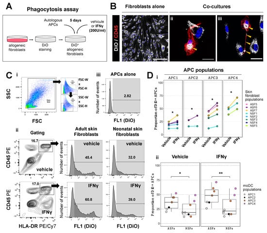 Phagocytosis is increased when human antigen presenting cells (APCs) are co-cultured with human adult skin fibroblasts or interferon (IFN) γ. (A) Schematic of the phagocytosis assay using the lipophilic fluorescent probe DiO. (B) Immunofluorescence of fibroblasts stained with DiO (shown in white), cultured (i) alone, or (ii,iii) with APCs stained with CD45 (shown in red). DAPI (shown in blue) depicts cell nuclei. Yellow arrowheads point to DiO incorporation by APCs. Representative images of APC2-ASF6 co-cultures. Scale bars: (i) 200 µm, (ii,iii) 15 µm. (C) Cytometric analysis of DiO incorporation by APCs. (i) Doublet exclusion strategy. (ii) Gating strategy to analyze DiO incorporation in CD45+ HLADR+ APCs co-cultured either with DiO+ Adult Skin Fibroblasts (ASFs) or DiO+ Neonatal Skin Fibroblasts (NSFs). Plots are generated on a biexponential scale. DiO expression is detected across the fluorescent detector channel 1 (FL1). (iii) Negative control of DiO incorporation by unlabeled APCs cultured without DiO+ fibroblasts. Representative graphs for APC3-ASF6 and APC3-NSF3 co-cultures are shown here. (D) DiO incorporation by moDCs expressed as the proportion of APCs that are DiO+ in APC-fibroblast co-cultures. (i) Data were segregated by APC donors and skin fibroblast populations across vehicle and IFNγ treatment conditions. (ii) The same data were represented after separating fibroblasts populations in two groups (ASF and NSF). Statistics: Wald test with Kenward-Roger’s multiple-comparison tests; * p < 0.05, ** p < 0.01, N = 15 different APC-fibroblast co-culture combinations.