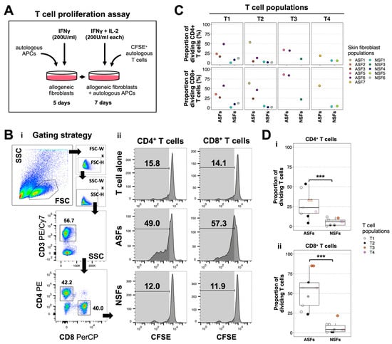 Alloresponsive T cell proliferation is increased in the presence of adult skin fibroblasts, but not neonatal skin fibroblasts. (A) Schematic of the T cell proliferation assay using carboxyfluorescein succinimidyl ester (CFSE) labeling. (B) Cytometric analysis of CD4+ and CD8+ T cell proliferation. (i) Gating strategy used to isolate CD4+ and CD8+ T cells. Plots are generated on a biexponential scale. (ii) Histograms showing CFSE expression in CD4+ and CD8+ T cell subsets across three different conditions: T cells alone, T cell-adult skin fibroblast (ASF) co-cultures, and T cell-neonatal skin fibroblast (NSF) co-cultures. Loss of CFSE expression indicate proliferation. The T cell alone control was used to set the gates defining the region of proliferating cells. Representative graphs for T1 alone, T1-ASF6 and T1-NSF6 co-cultures are shown here. (C) Proportion of dividing CD4+ and CD8+ T cells in co-cultures with N = 11 different skin fibroblast populations. Data were segregated by T cell donors (T1, T2, T3 and T4) and skin fibroblast populations (either adult-ASFs, or neontal-NSFs). (D) The same data were represented after separating fibroblast populations between ASF and NSF groups for CD4+ and CD8+ T cells. Statistics: ANOVA with Tukey’s multiple-comparison tests; *** p < 0.001, N = 18 different T cell-fibroblast co-culture combinations.