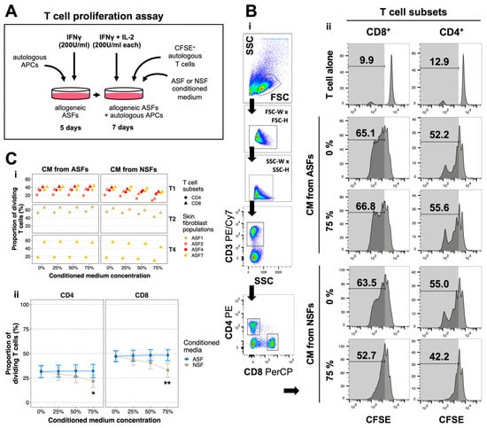 Conditioned medium from neonatal skin fibroblasts, but not from adult skin fibroblasts, attenuates alloresponsive T cell proliferation. (A) Schematic of the T cell proliferation assay using CFSE. (B) Cytometric analysis of CD4+ and CD8+ T cell proliferation. (i) Gating strategy used to isolate CD4+ and CD8+ T cells. Plots are generated on a biexponential scale. (ii) Histograms showing CFSE expression in CD4+ and CD8+ T cell subsets across three different conditions: T cells alone, T cell-adult skin fibroblast (ASF) co-cultures supplemented with conditioned medium (CM) from neonatal skin fibroblasts (NSFs), and T cell-ASF co-cultures supplemented with CM isolated from the same ASFs. Increasing doses of CM were added (0%, 25%, 50%, and 75%). Loss of CFSE expression indicates proliferation. The T cell alone control was used to set the gates defining the region of proliferating cells. Representative graphs for T2 alone and T2-ASF1 co-cultures are shown here. (C) Proportion of dividing T cells in N = 5 T cell-ASF co-cultures. (i) Data are segregated by T cell donors (T1, T2, T4), ASF populations (ASF1, ASF2, ASF4, ASF7), T cell subsets (CD4, CD8), and CM sources (from ASFs or NSFs). (ii) The same data were represented after separating CM sources between ASF and NSF groups for CD4+ and CD8+ T cells. Statistics: Wald test with Tukey’s multiple-comparison tests; * p < 0.05, ** p < 0.01, N = 5 different T cell-ASF co-culture combinations.