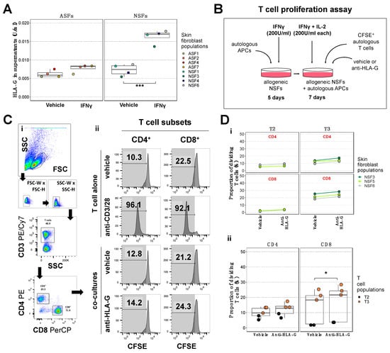 Blockade of neonatal fibroblast-derived HLA-G is necessary but not sufficient to suppress neonatal fibroblast-induced impairment of alloresponsive T cell proliferation. (A) Detection of HLA-G activity in concentrated supernatants of adult (ASFs) and neonatal (NSFs) skin fibroblasts after treatment with 200 U/mL interferon (IFN) γ or a vehicle. (B) Schematic of the T cell proliferation assay using CFSE. (C) Cytometric analysis of CD4+ and CD8+ T cell proliferation. (i) Gating strategy used to isolate CD4+ and CD8+ T cells. Plots are generated on a biexponential scale. (ii) Histograms showing CFSE expression in CD4+ and CD8+ T cell subsets across four different conditions: T cells alone with or without addition of anti-CD3/28 proliferation activators, and T cell-NSFs co-cultures supplemented with or without an anti-HLA-G neutralizing inhibitor. Loss of CFSE expression indicate proliferation. The T cells alone controls were used to set the gates defining the region of proliferating cells. Representative graphs for T3 alone and T3-NSF5 co-cultures are shown here. (D) Proportion of dividing T cells in N = 5 T cell-NSF co-cultures. (i) Data are segregated by T cell donors (T2, T3), NSF populations (NSF3, NSF5, NSF6), T cell subsets (CD4, CD8), and treatment conditions (vehicle or anti-HLA-G). (ii) The same data are represented after grouping all co-culture combinations across the two treatment conditions for CD4+ and CD8+ T cell subsets. Statistics: (A) Wald test with Tukey’s multiple-comparison tests; *** p < 0.001, (D) Wald test with Kenward-Roger’s multiple-comparison tests; * p < 0.05, N = 5 different T cell–NSF co-culture combinations.