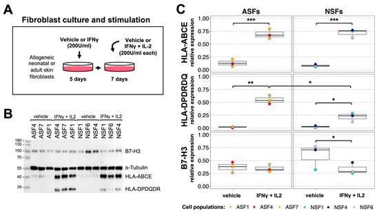 Neonatal skin fibroblasts primed with inflammatory signals express less molecules that activate the immune system. (A) Schematic of the protocol used to stimulate neonatal (NSFs) and adult (ASFs) skin fibroblasts. (B) Western blots on ASF and NSF lysates for the detection of HLA-ABCE, HLA-DPDQDR, B7-H3 and α-tubulin (used as a loading control). (C) Densitometry quantifications normalized to α-tubulin. Statistics: Wald test with Tukey’s multiple-comparison tests; * p < 0.05, ** p < 0.01, *** p < 0.001, N = 6 different fibroblast populations (3 NSFs and 3 ASFs).