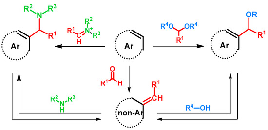 Regarding alkoxyalkylations, the Mannich or Betti reactions can be regarded as related. The latter reactions can occur via two main mechanisms: one starting with the formation of an iminium ion and its subsequent addition to the electron-rich aromatic ring, the other starting with the formation of a quinone methide and the subsequent aza-Michael addition of the amine to the methylidene group [1,2]. Taking the similarities of the hydroxy- or alkoxyalkylation of arenes into consideration, in scientific literature the latter mechanism, starting from quinone methides and the oxy-Michael addition of an alcohol, is currently the more frequently proposed mechanism [3,4]. However, considering the fact that alkoxyalkylation is reported as directly using acetals [5,6,7,8], the analogous compounds of imines, the hypothesis of their reaction with aromatic rings should not be neglected.