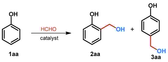 The hydroxymethylation of phenol was examined using formaldehyde. Due to the activation of hydroxyl function, two regioisomeric hydroxymethylated products (2 and 3) can be formed. Since both of the products are important chemicals in industry [17,18] or are important precursors toward the synthesis of bioactive compounds [19,20,21], the selectivity of the reaction is critical (Scheme 1). The effect of the divalent metal salts on the regioselectivity was examined by Komiyama and Morozumi [22]. It was found that without catalyst, or by using MgCl2, CuCl2 and FeCl2, the ratio 2aa/3aa was between 1 and 1.5. By applying divalent zinc salts such as Zn(H3CCOO)2, Zn(NO3)2 or ZnBr2, the selectivity could be shifted toward the formation of 2aa, and the ratio 2aa/3aa was around 10 [22]. The synthesis of 2aa was also published by Jeong and Hu[23]. For the synthesis, to provide the selectivity, Zn(NO3)2.6H2O was applied, and 2-hydroxymethylphenol (salicyl alcohol: 2aa) was further transformed to benzofuran derivatives [23].