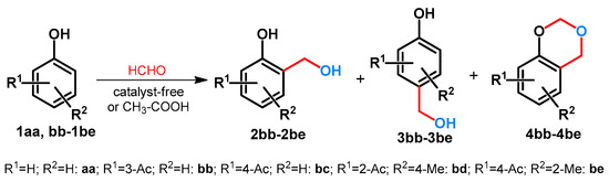 Hydroxymethylation of phenol (1aa) and phenolic ketones (1bb-1be) was investigated by Goswami et al. [29]. The reactions were conducted at 60–70 °C. It was found that depending on the phenolic substrate:paraformaldehyde ratios, different products could be isolated. It was also assumed that for the formation of 1,3-dioxane derivatives 4, the necessary paraformaldehyde ratio depended on the phenol or phenolic ketones (1) in question. Starting from 1aa it was 1:3, from 1bb and 1bc 1:7, while from 1be the ratio was 1:12. It is interesting to note that starting from 1bd, even by using an extreme excess of paraformaldehyde (1:9), formation of 4bd was not observed (Scheme 2) [29].