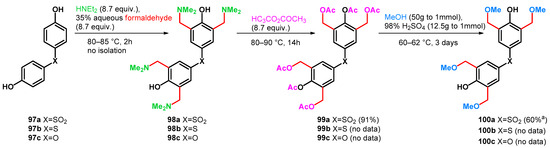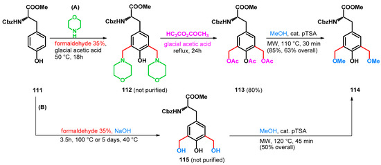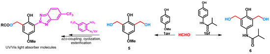 The previous syntheses, by using different additives or catalysts, attempted to avoid the dihydroxymethylation of phenols. In some cases, the extra hydroxymethyl function can be further used to build bioactive sidechains. For example, the hydroxymethyl group of compound 5 (Scheme 3) was further transformed to benzotriazole moiety [30], while 6 (Scheme 3) was used as an important crosslinking agent [31].
