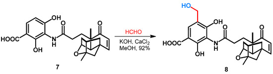Duan et al. reported the hydroxymethylation of platensimycin (7) as an excellent natural-product-derived lead molecule against various gram-positive pathogens. The synthesis was performed in MeOH, by using formaldehyde and inorganic additives KOH and CaCl2, leading to the formation of 8 in an excellent yield (Scheme 4) [32].